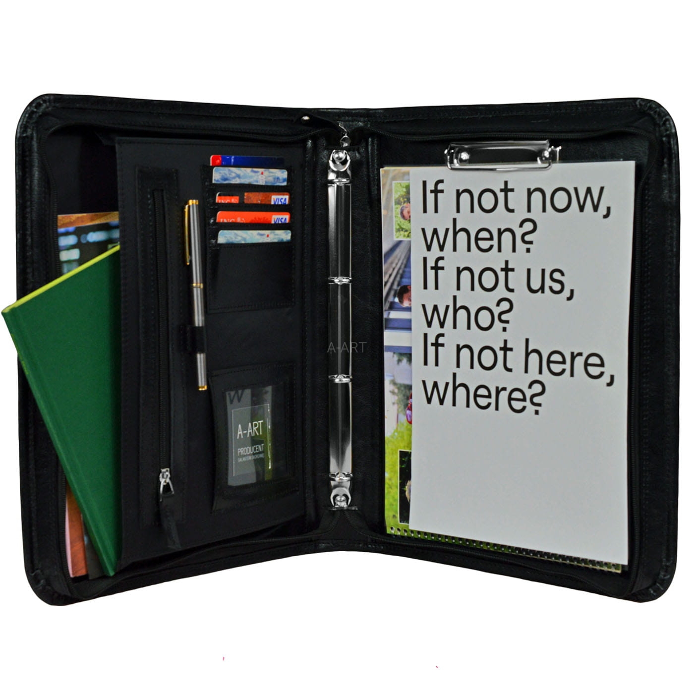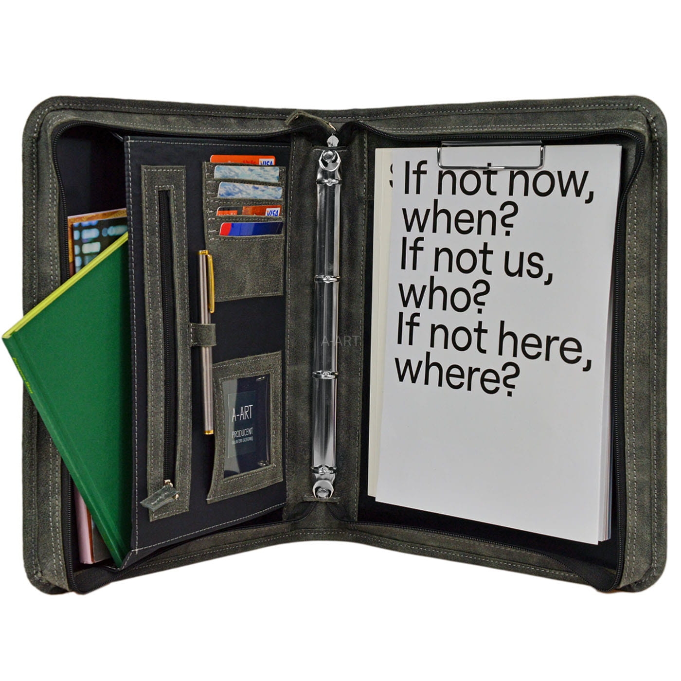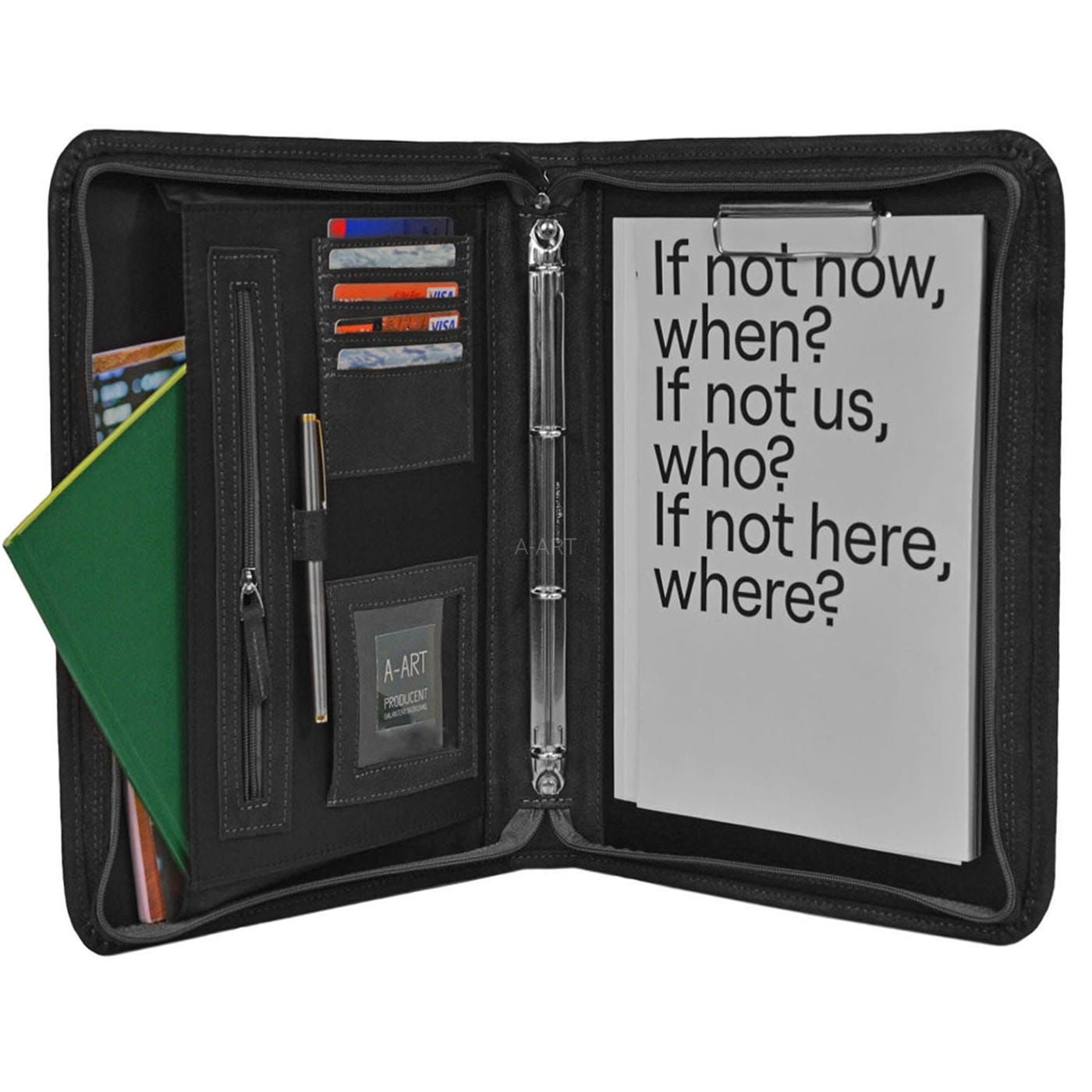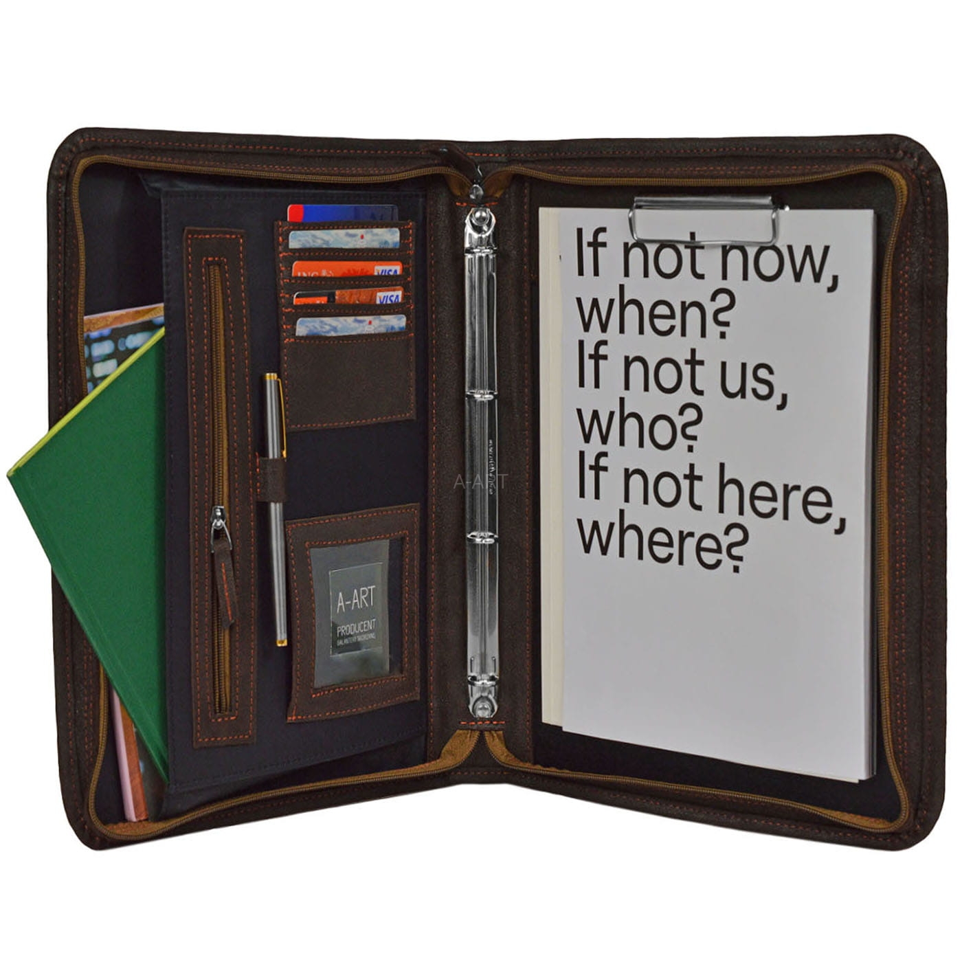 Ręcznie uszyta aktówka biznesowa, posiada optymalnie zaprojektowane wnętrze obszyte elegancką czarną podszewką. W środku znajdują się kieszonki, uchwyty na długopisy, klips, ringi do wpinania dokumentów formatu A5.