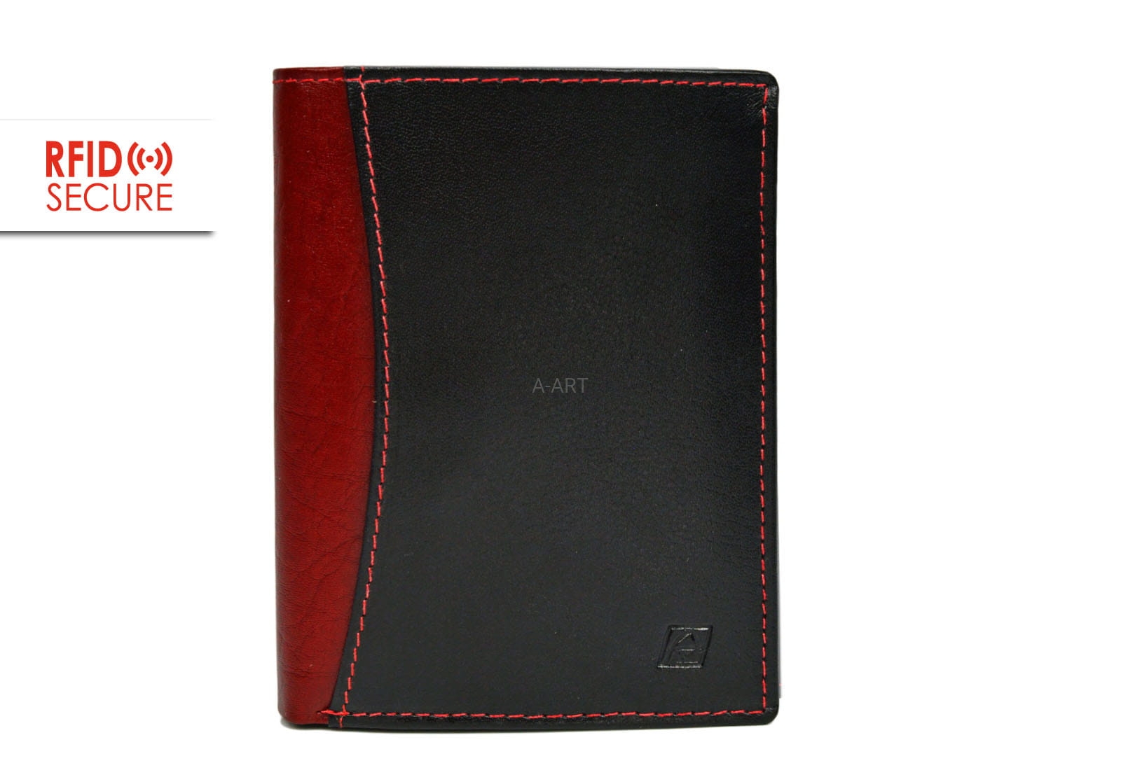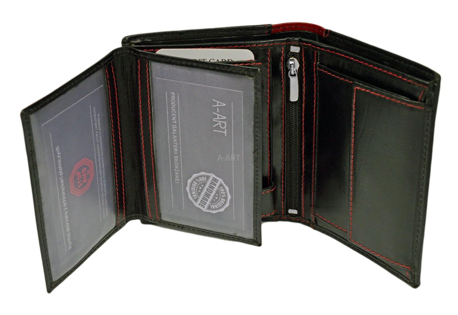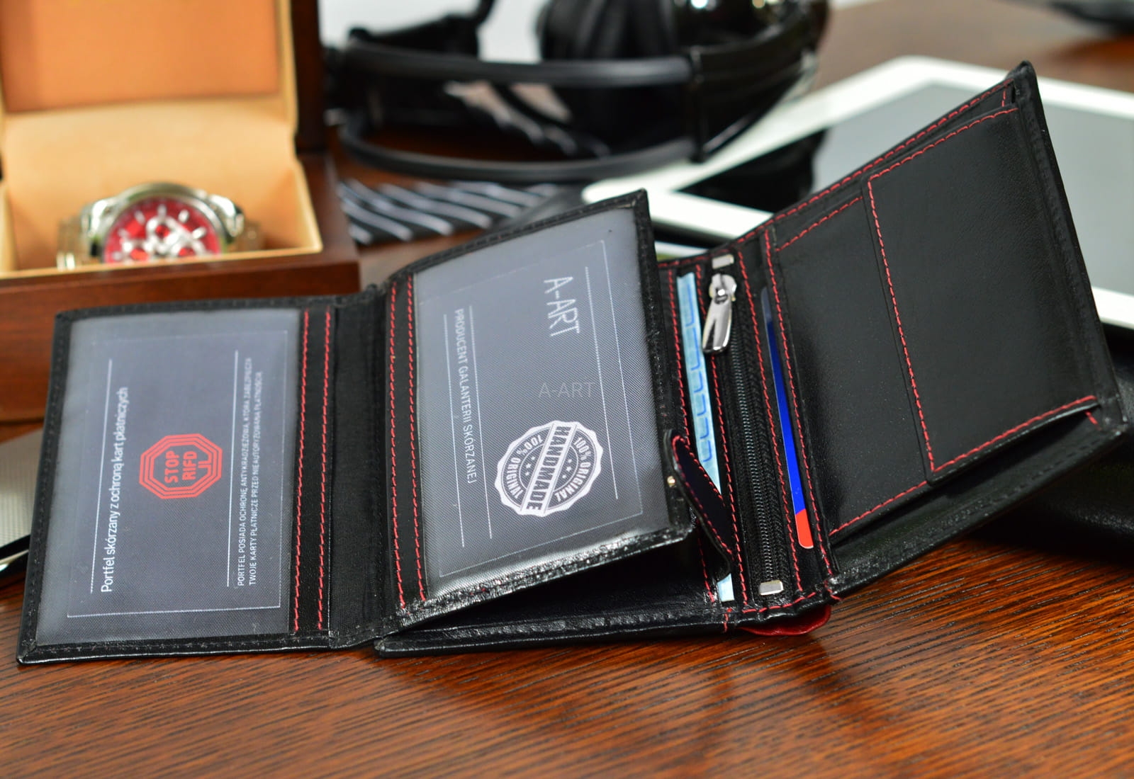 Portfel wykonany w nowoczesnej technologii z innowacyjną podszewką blokującą sygnały RFID, która chroni karty płatnicze przed nieautoryzowanym skanowaniem.