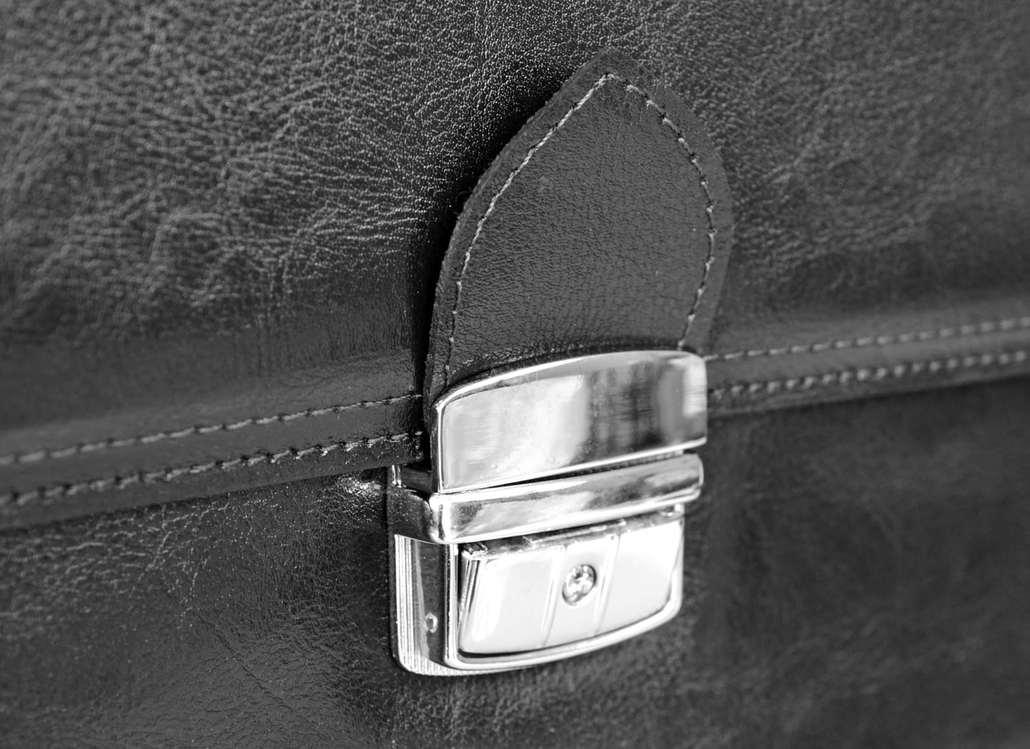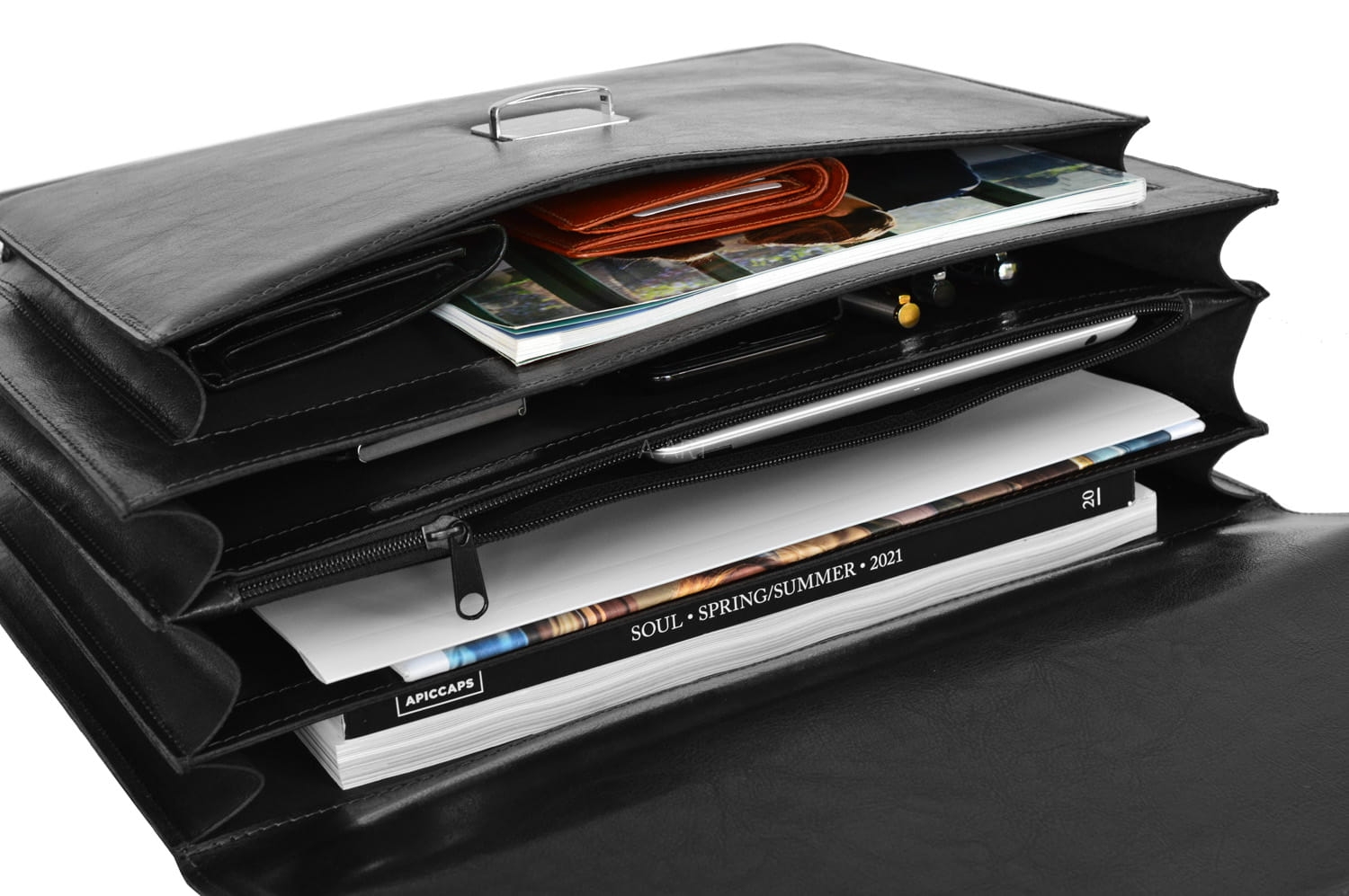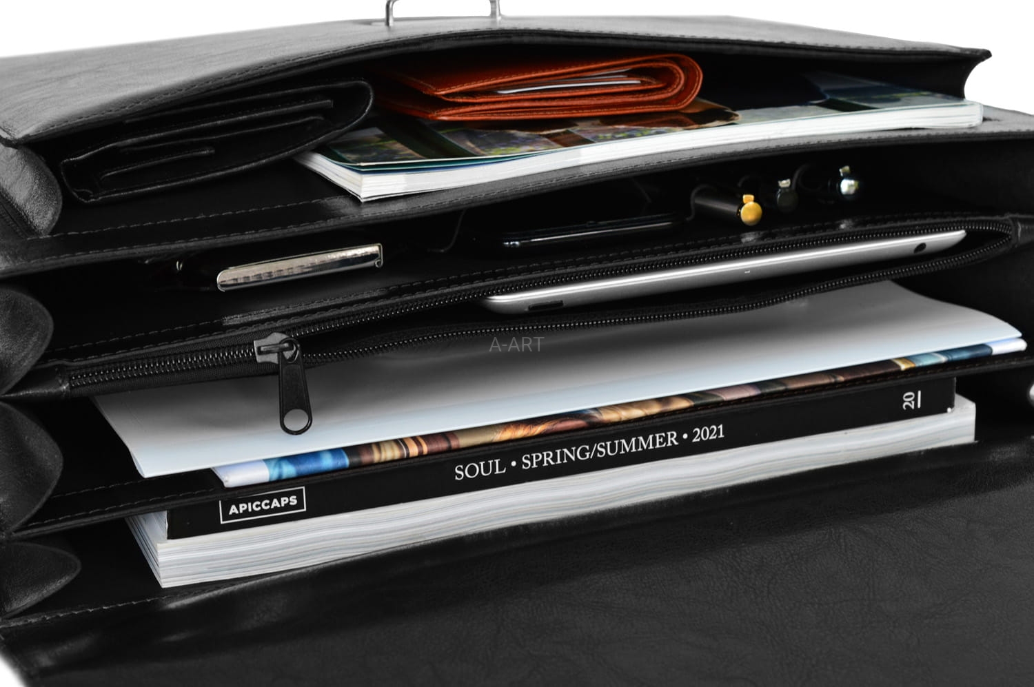 Teczka zamykana klapą na włoski zamek typu tic-tac w środku znajdują się 3 pojemne komory.