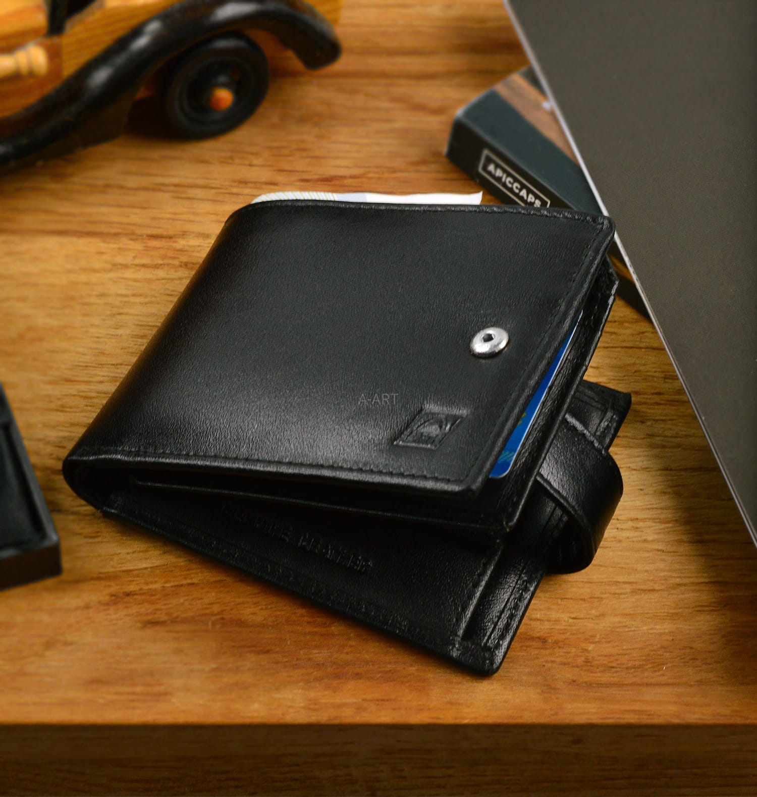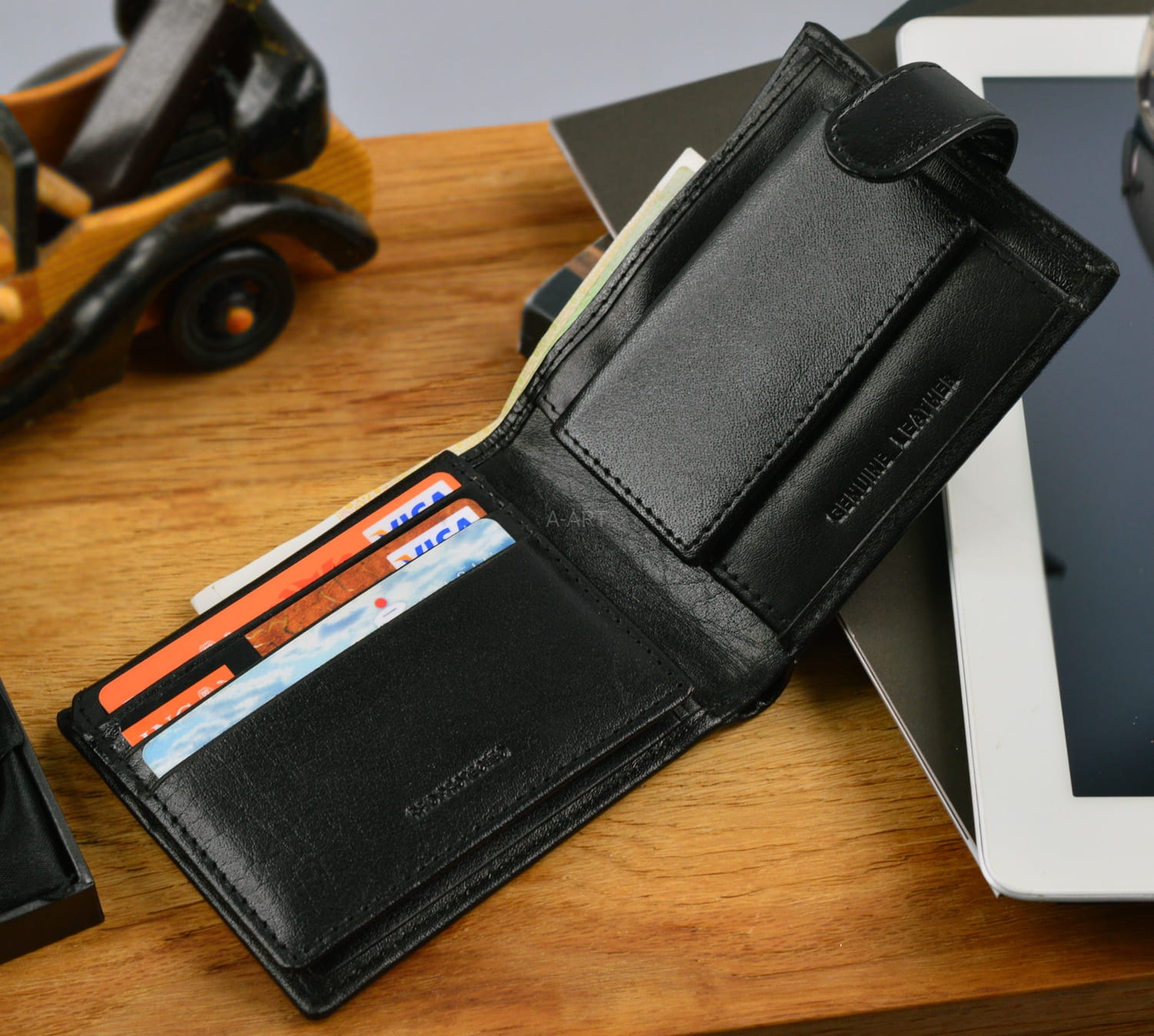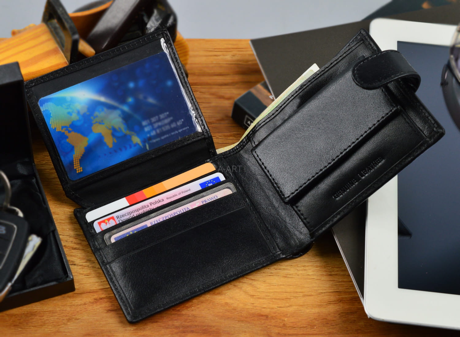 - Mieści prawo jazdy, dowód osobisty i karty płatnicze,