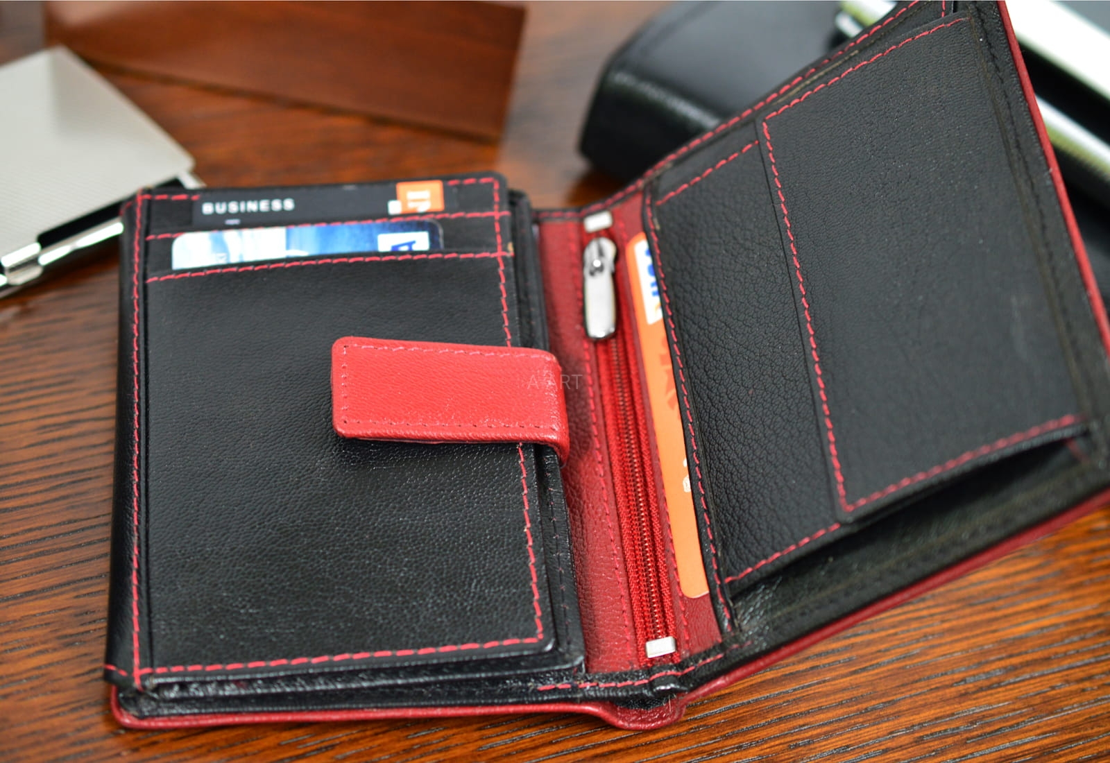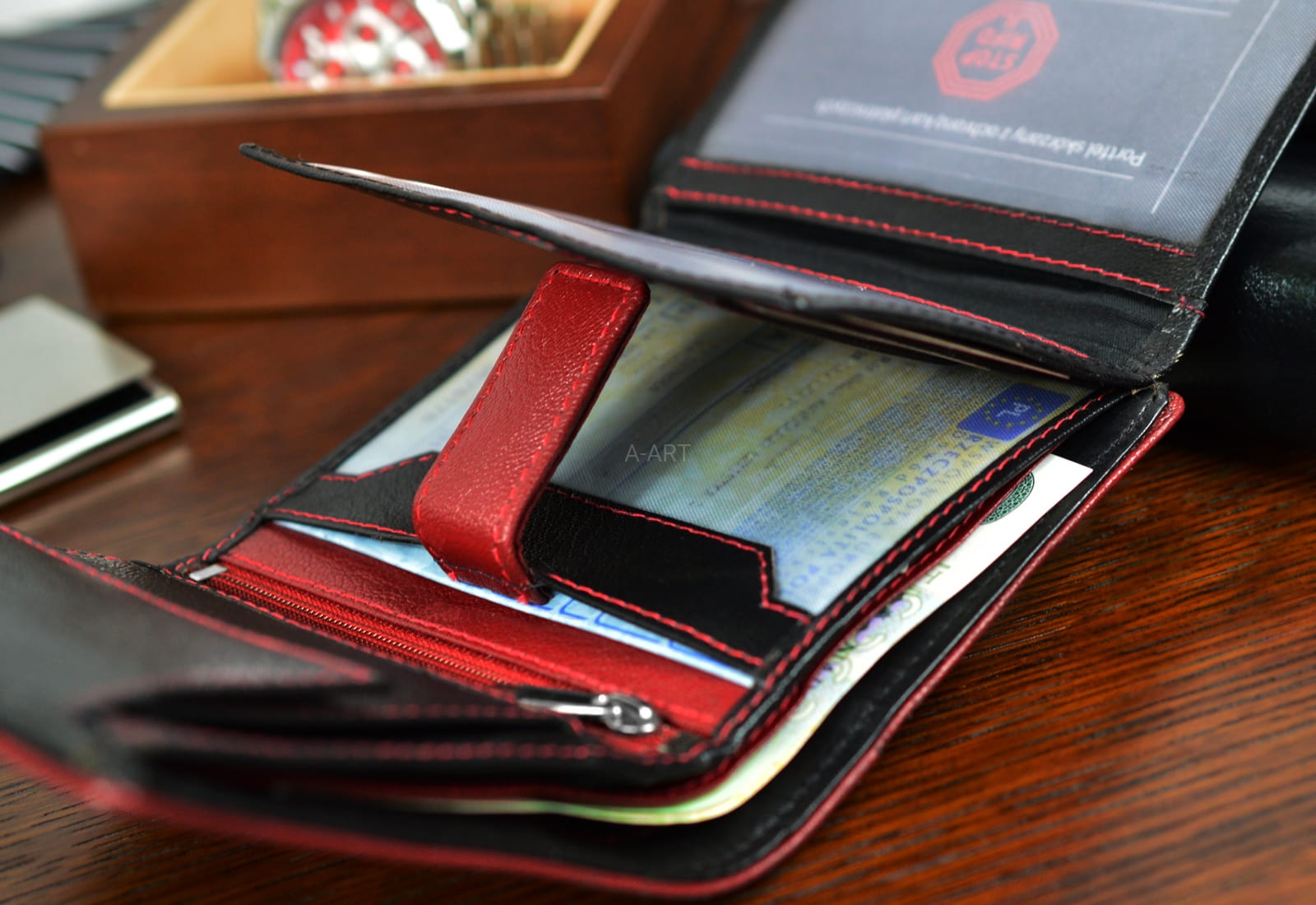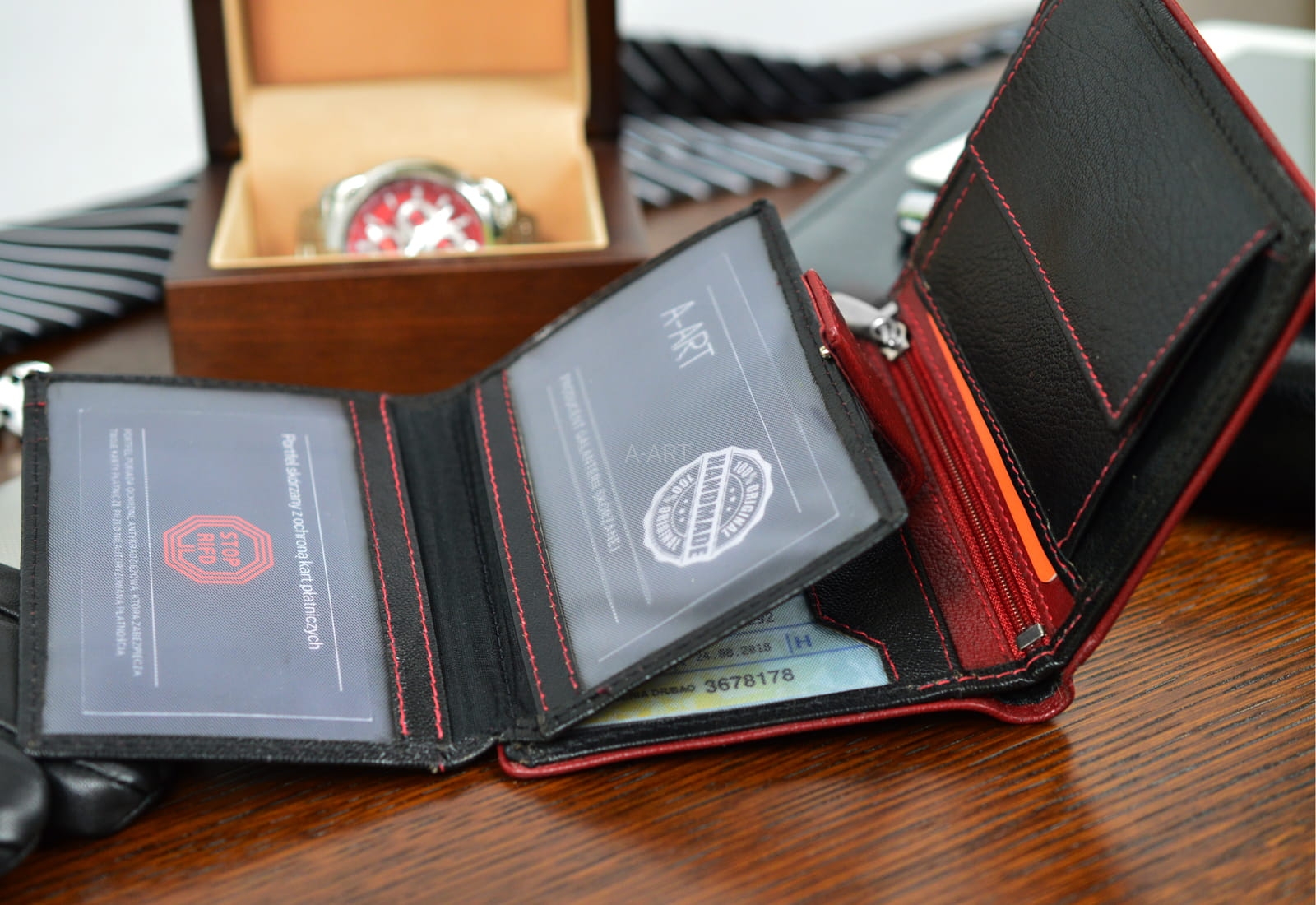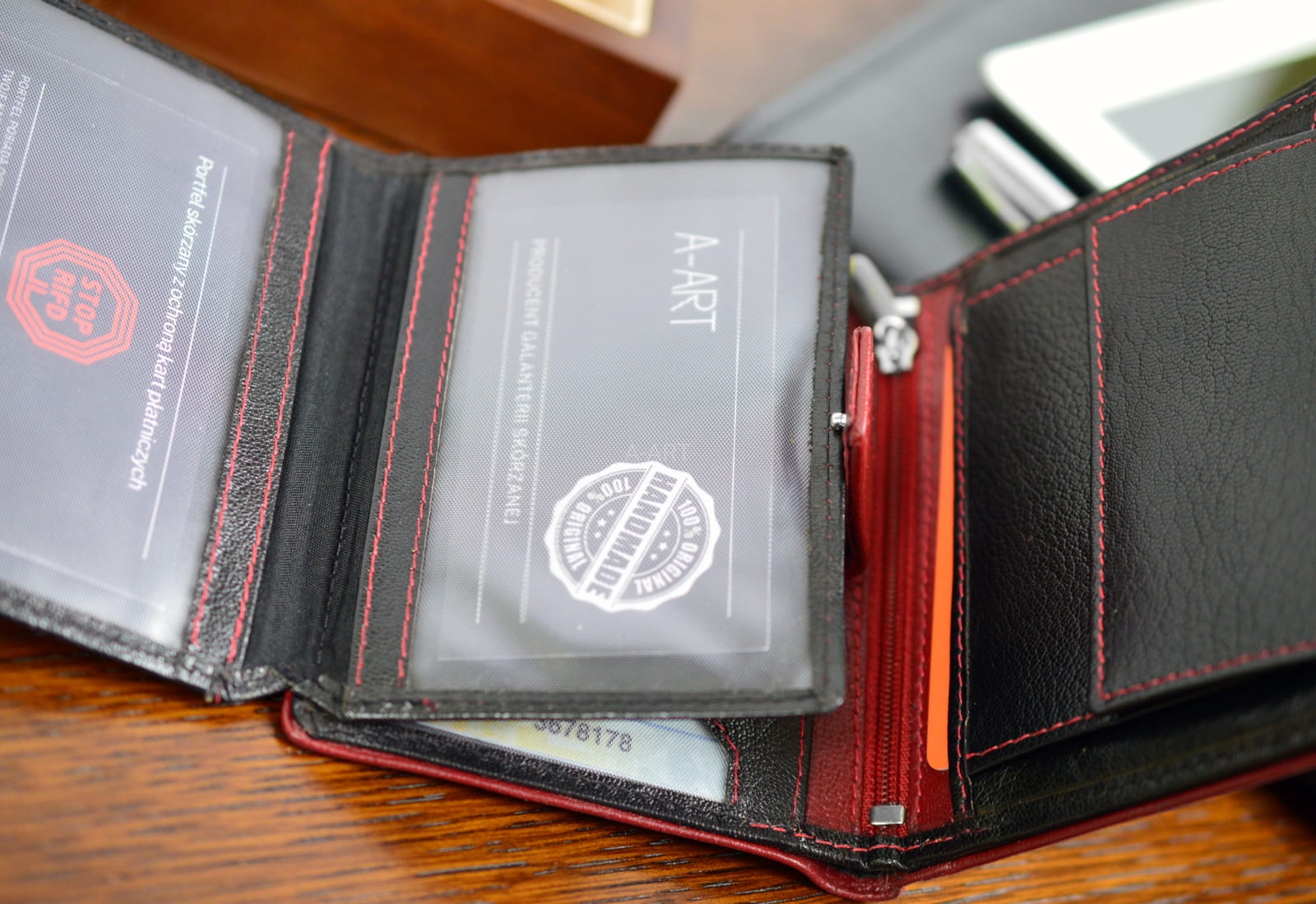 - Mieści prawo jazdy, dowód osobisty i karty płatnicze,