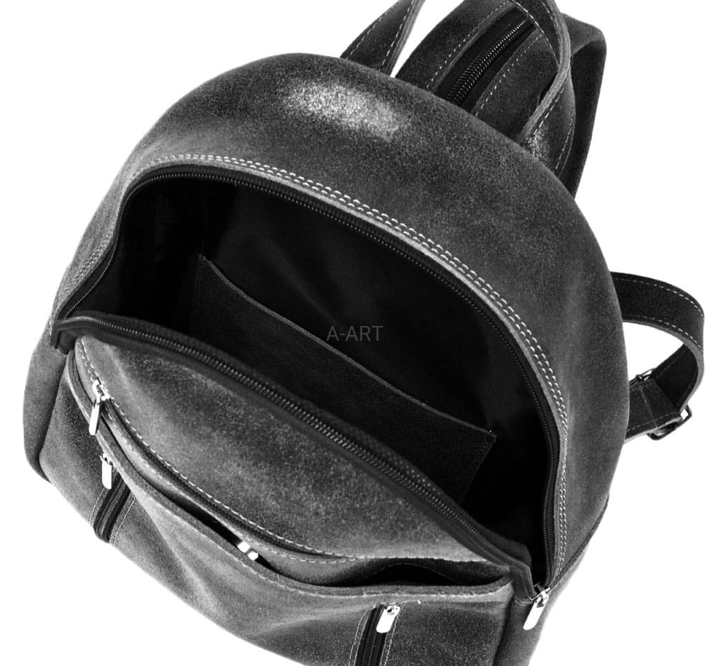 Praktyczny i funkcjonalny plecak skórzany z jedną dużą komorą wewnątrz. Z przodu plecaka znajdują się dwie małe zewnętrzne kieszonki o wymiarach 11 x 12cm.