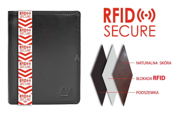 Portfel skórzany wykonany w nowoczesnej technologii z innowacyjną podszewką blokującą sygnały RFID, która chroni karty płatnicze przed zeskanowaniem.