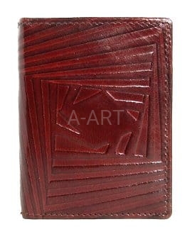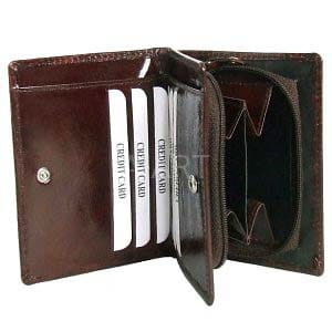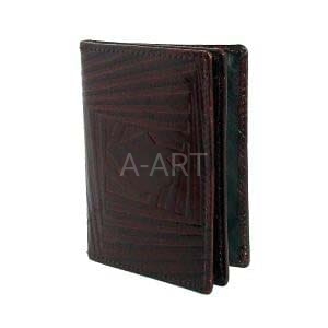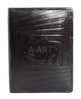 Portfel zapinany patką na zatrzask. Posiada 1 kieszeń na banknoty, 3 kieszonki na karty płatnicze, 1 kieszonkę nieco większą od karty płatniczej, 3 większe kieszenie z folią, zapinaną na zatrzask zewnętrzną kieszeń na monety i 1 kieszonkę - schowek w przegrodzie kieszeni na monety zamykaną na zamek błyskawiczny.