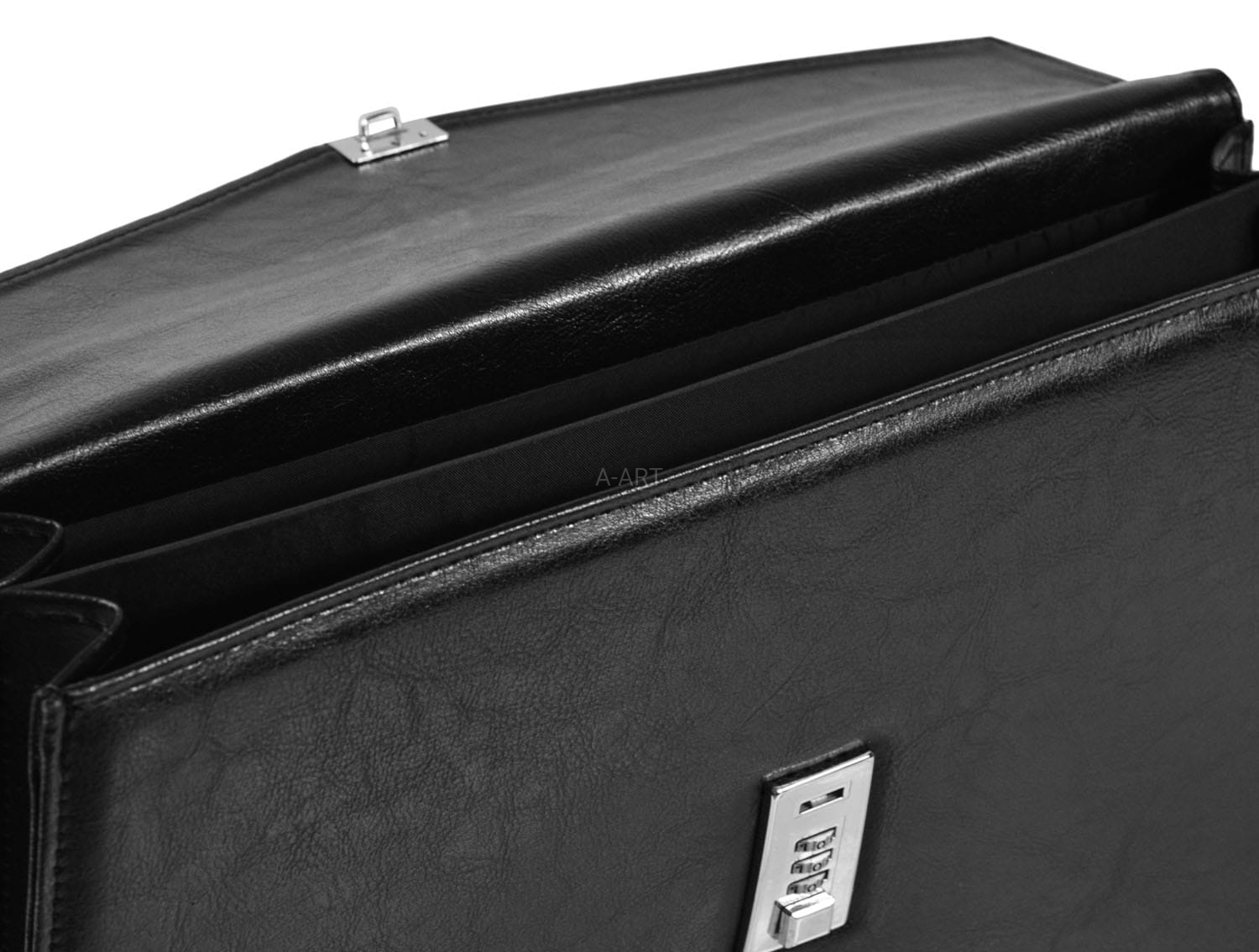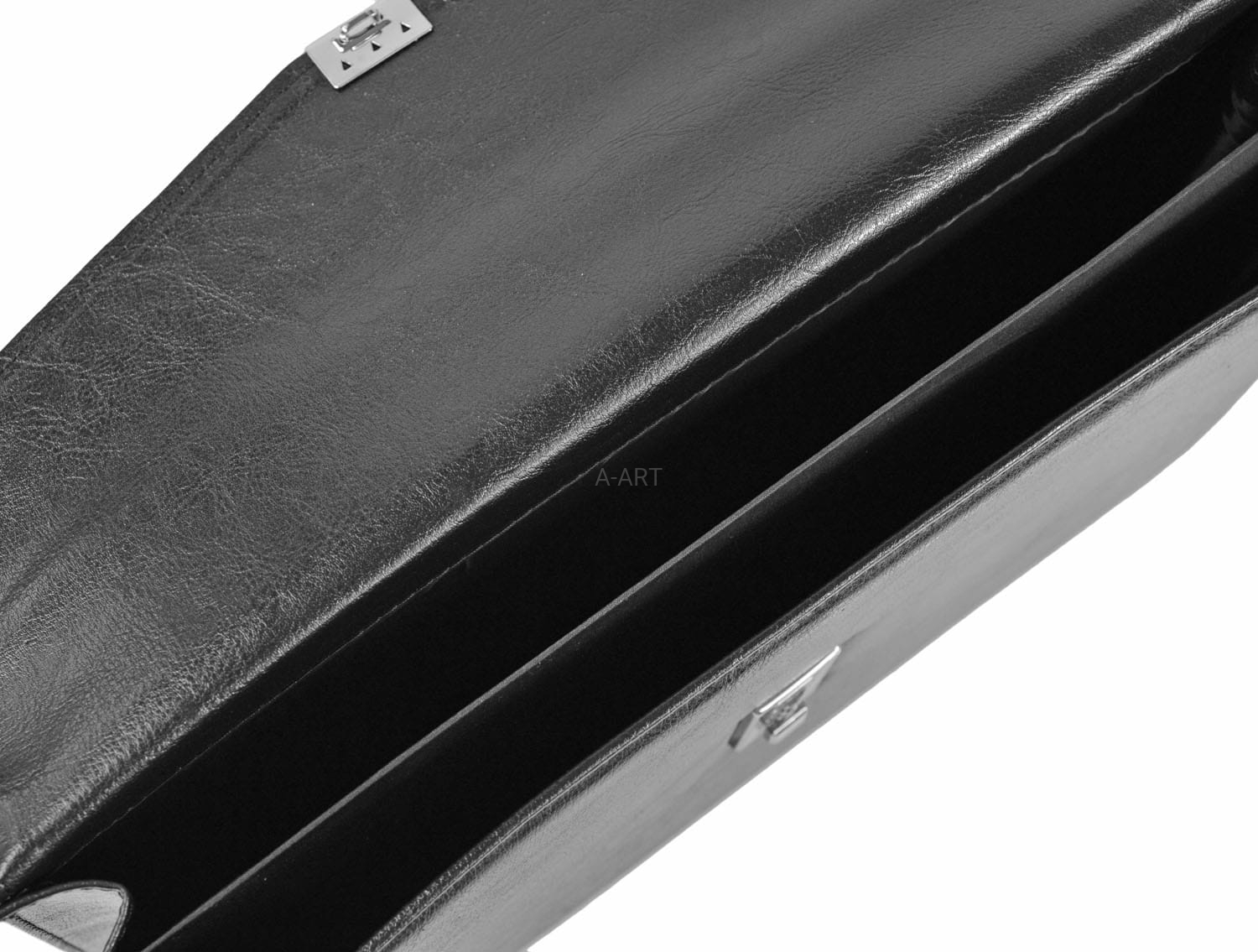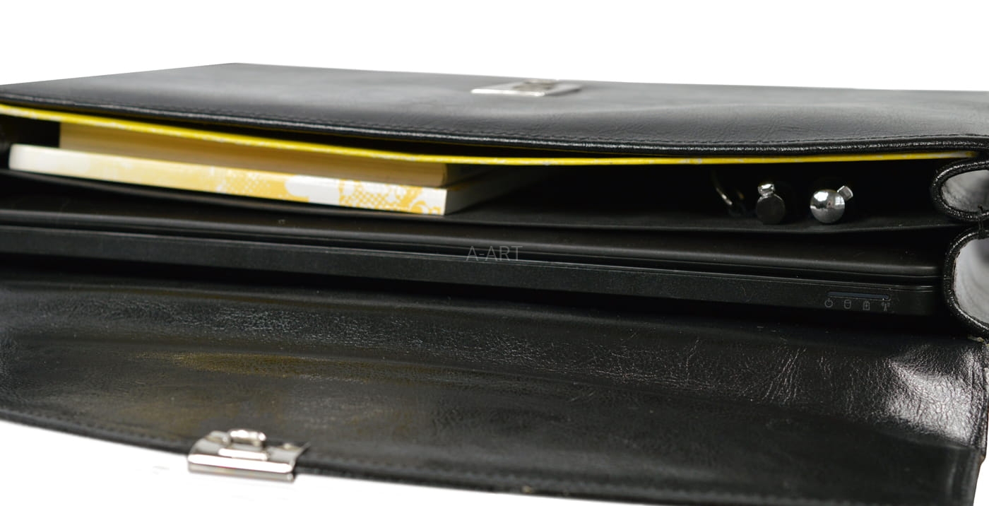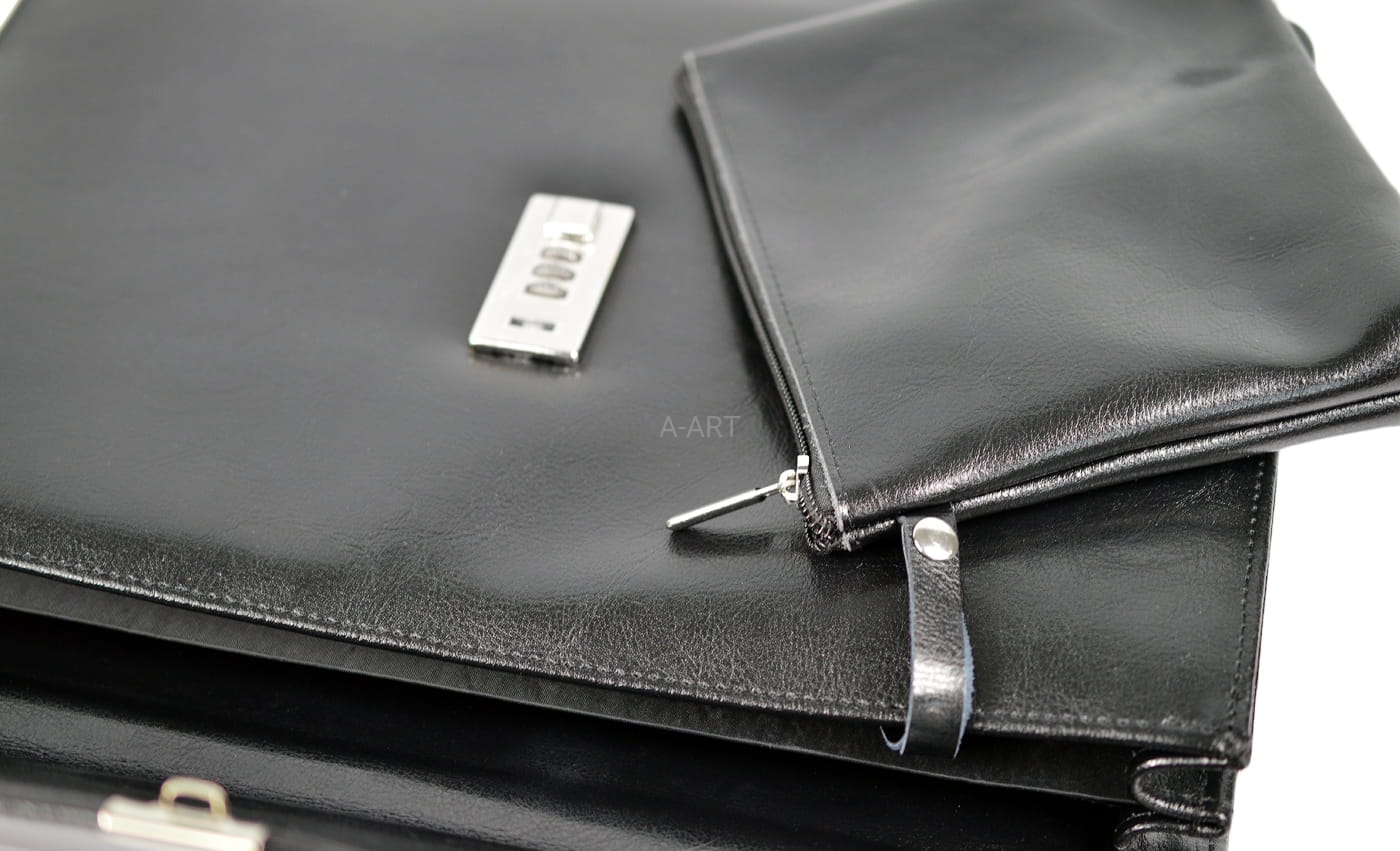 Aktówka została uszyta ze skóry naturalnej w kolorze czarnym i w swoim wyposażeniu posiada skórzaną kosmetyczkę na niezbędne drobiazgi.
