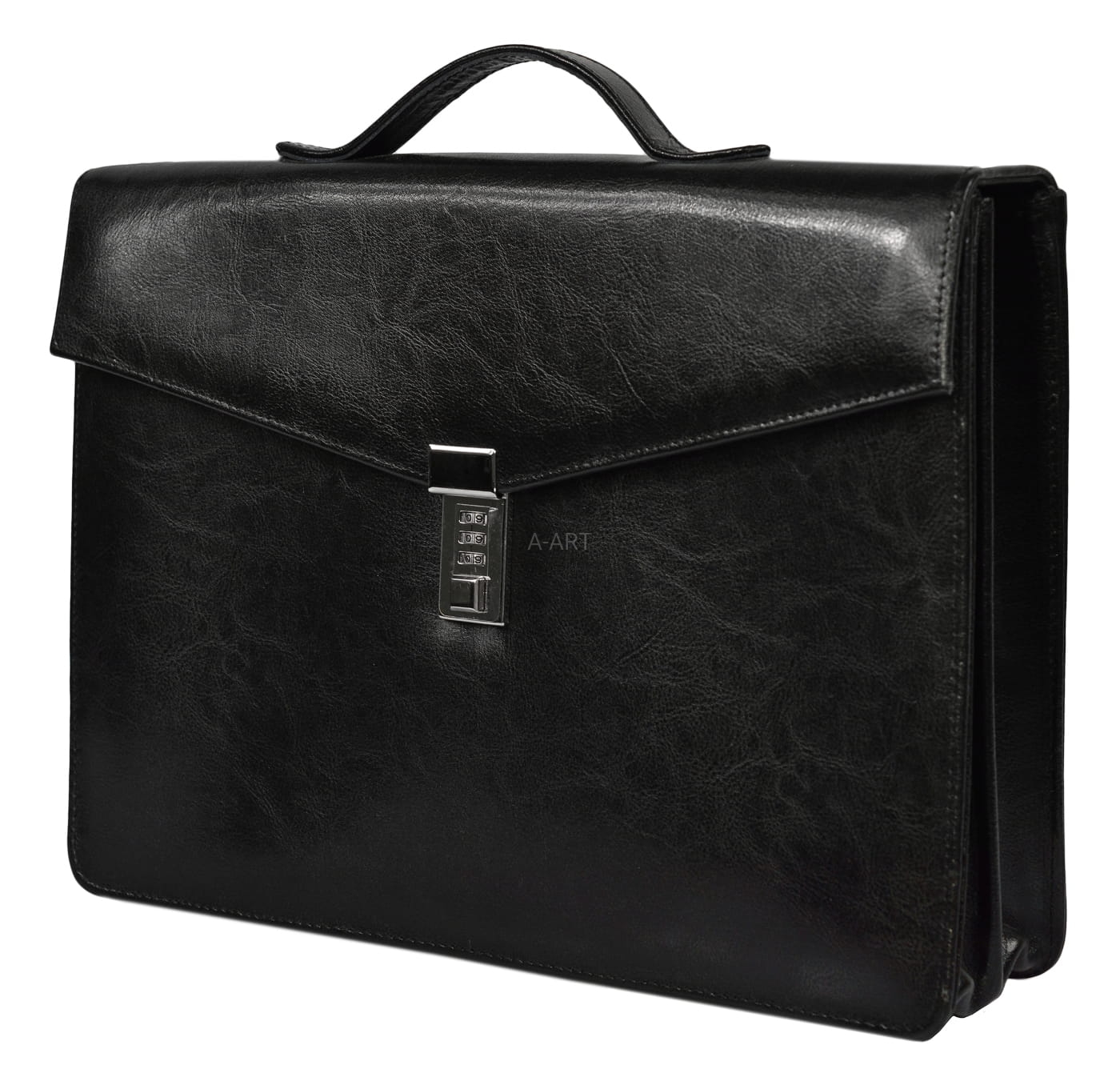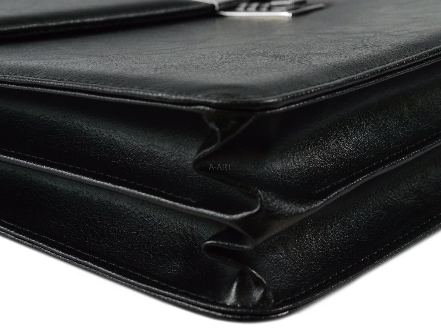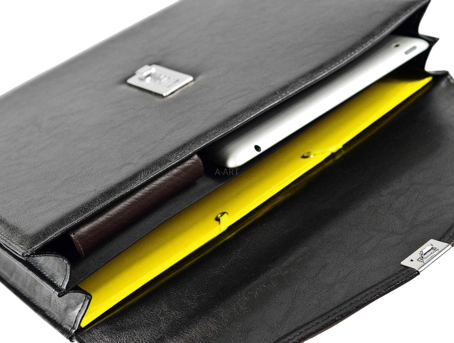 Aktówka została uszyta ze skóry naturalnej w kolorze czarnym i w swoim wyposażeniu posiada skórzaną kosmetyczkę na niezbędne drobiazgi.