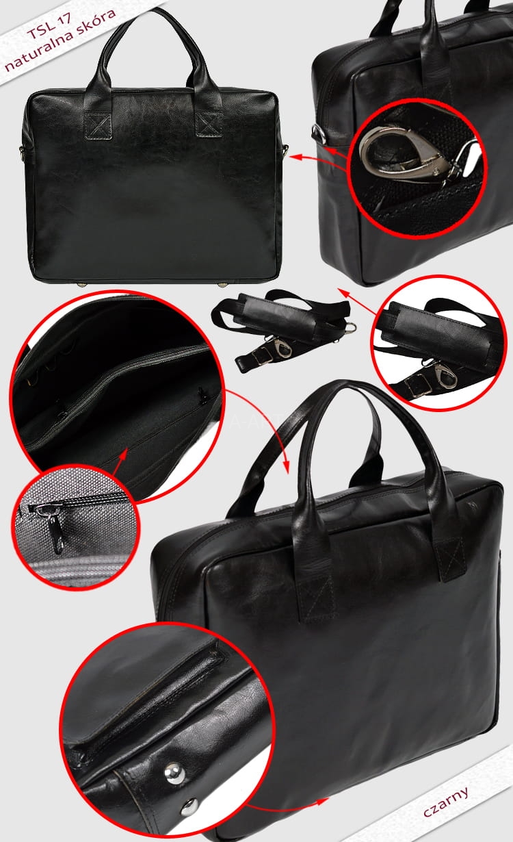 Klasyczna skórzana torba na laptopa 15'' w kolorze czarnym. Pojemna i wygodna torba na laptopa została wykonana ręcznie z wysokiej jakości skóry naturalnej.