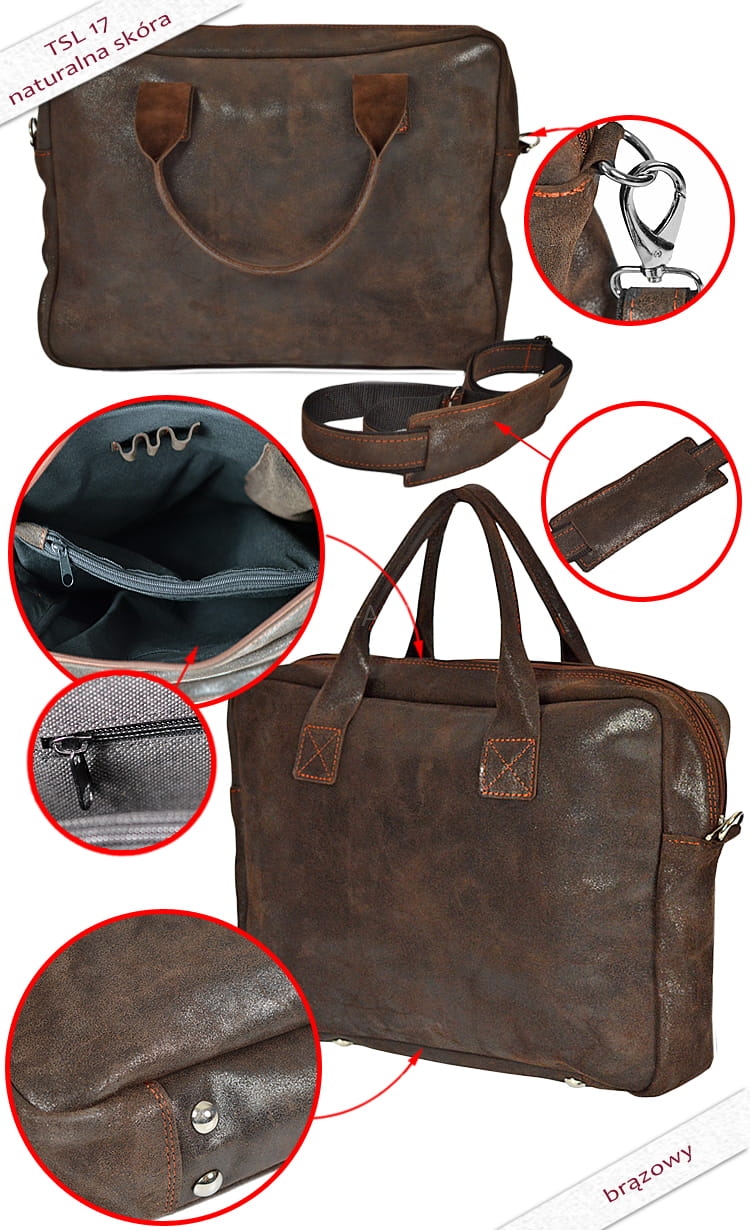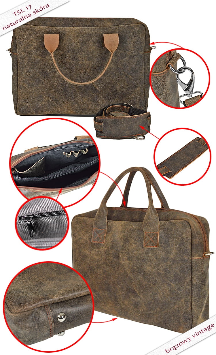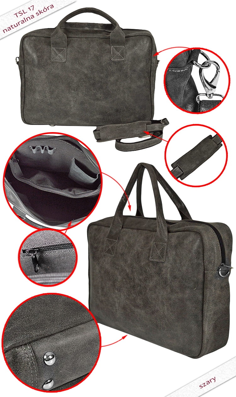 Skórzana torba na laptopa 15'' wykonana z wysokiej jakości skóry naturalnej. Teczka dostępna w kolorach brązowym, brązowym-vintage, grafitowym, szarym. Modna, funkcjonalna, pakowna mieści format większy od A4.