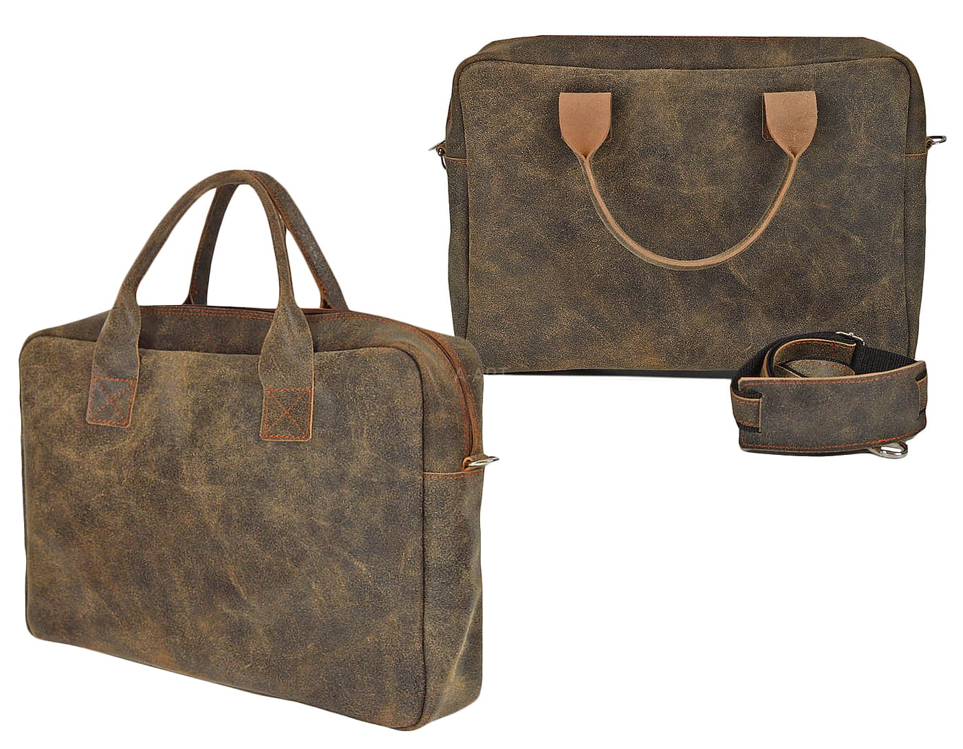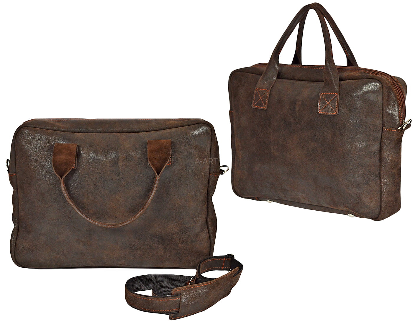 Duża, dwukomorowa torba skórzana na laptopa do ręki i na ramię. Mieści laptopa 17 cali oraz teczki z dokumentami formatu większego niż A4. Torba ręcznie uszyta ze skóry naturalnej, postarzanej w stylu vintage.