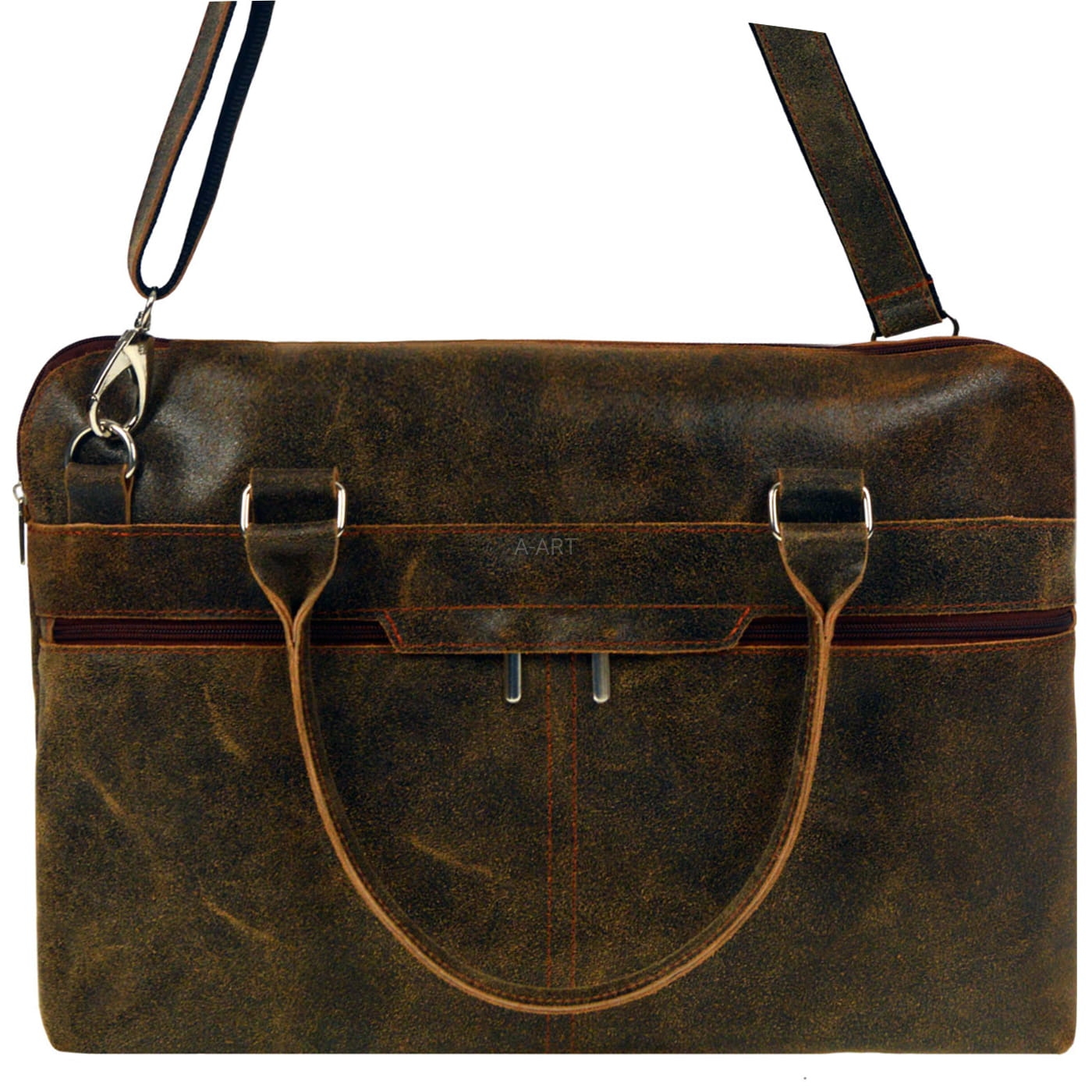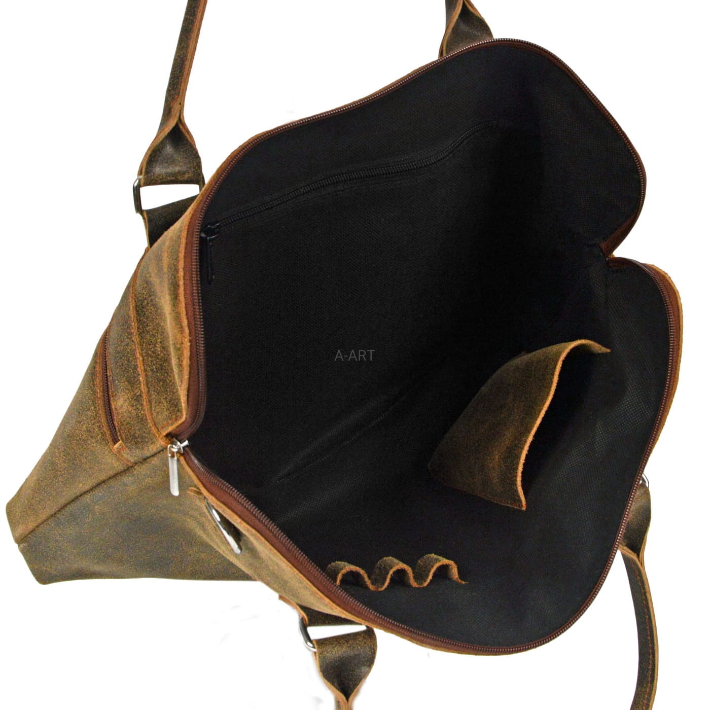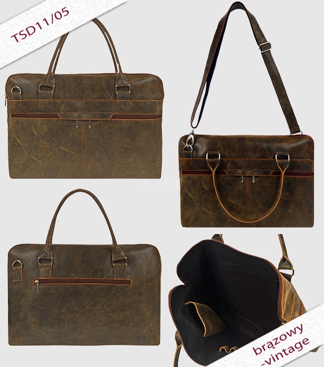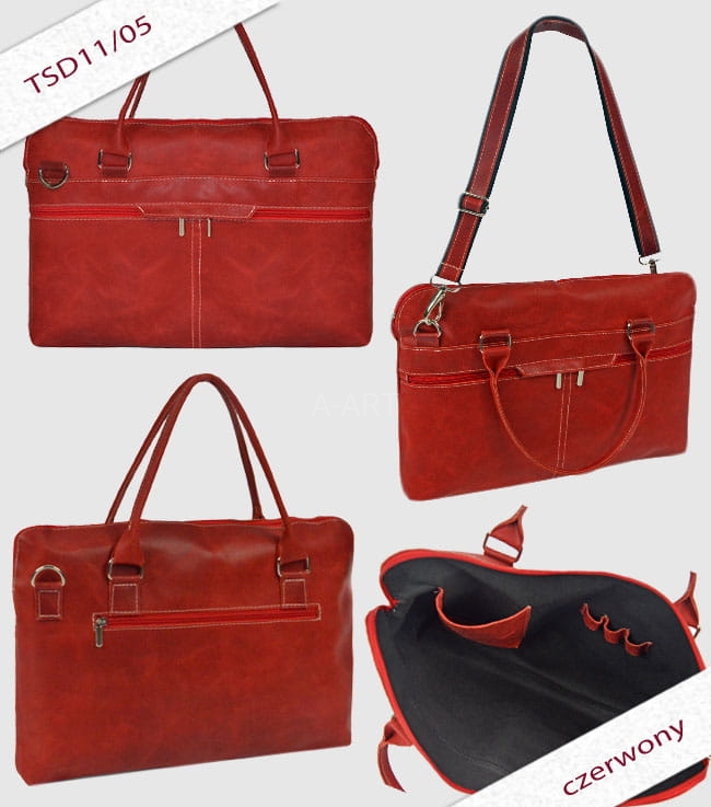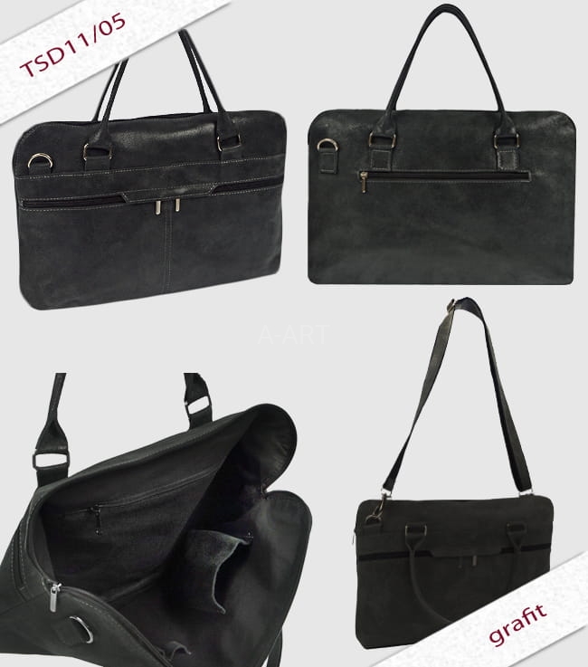 Torba skórzana dostępna w kolorach brązowym, czarnym, czerwonym i grafitowym. Mieści format A4, można ją nosić na ramieniu lub w ręku.