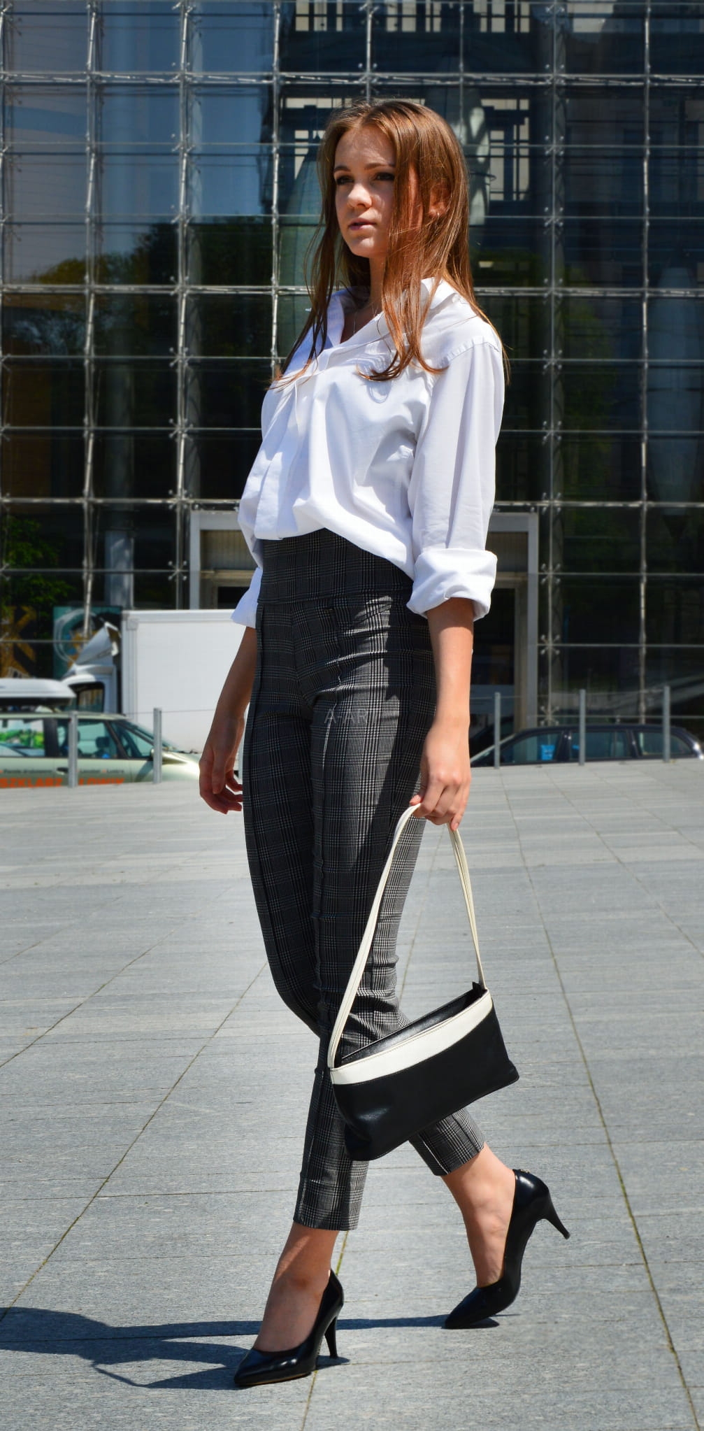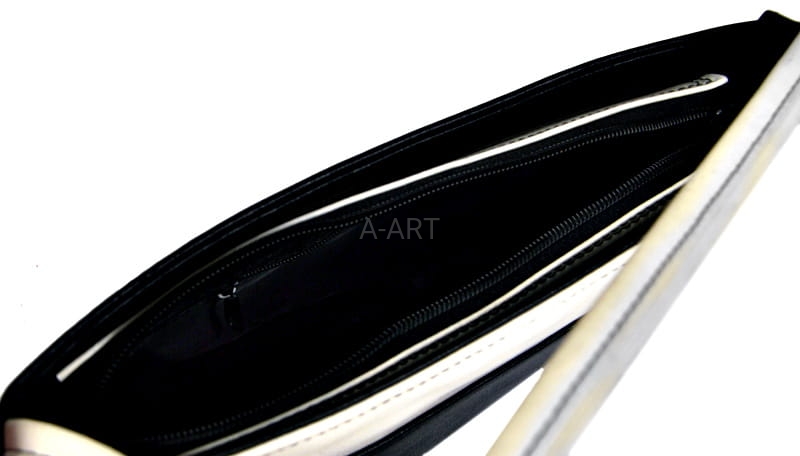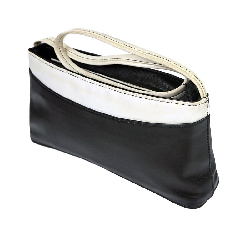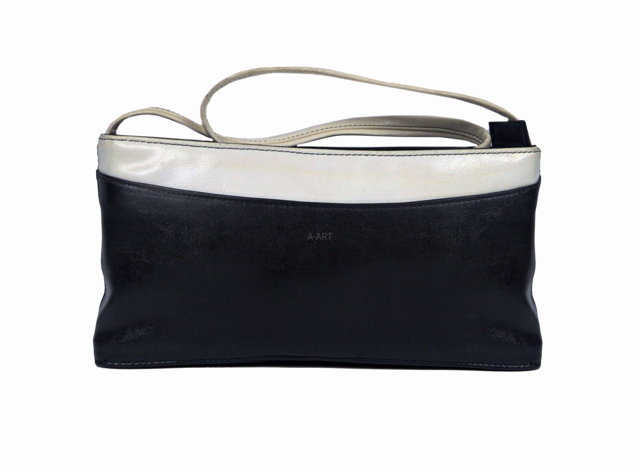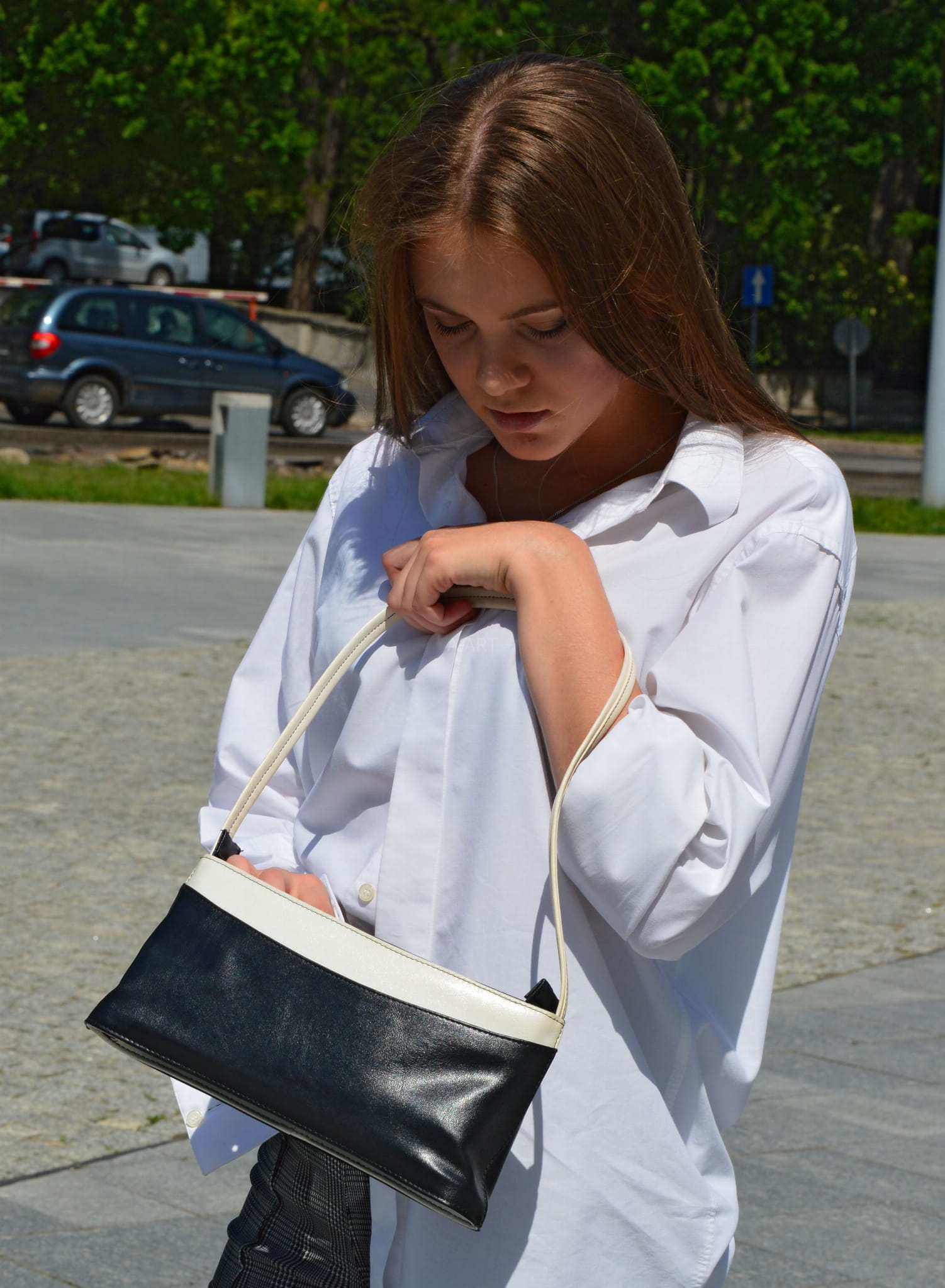 Wizytowa, biało-czarna torebka na ramię. Elegancka, mała torebka wykonana z materiału imitującego skórę. Torebka damska typu kopertówka na ramię zapinana na suwak.